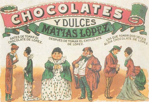 «Matías López fue también un visionario del marketing. En una época donde el 50% de la población era analfabeta, entendió que su publicidad debía ser visual. Así nació el famoso cartel “Los gordos y los flacos”, diseñado por el litógrafo N. González y el dibujante Francisco Ortego Vereda. En él se veía a dos personajes antes y después de comer chocolate: primero delgados y tristes, luego gordos y felices.«